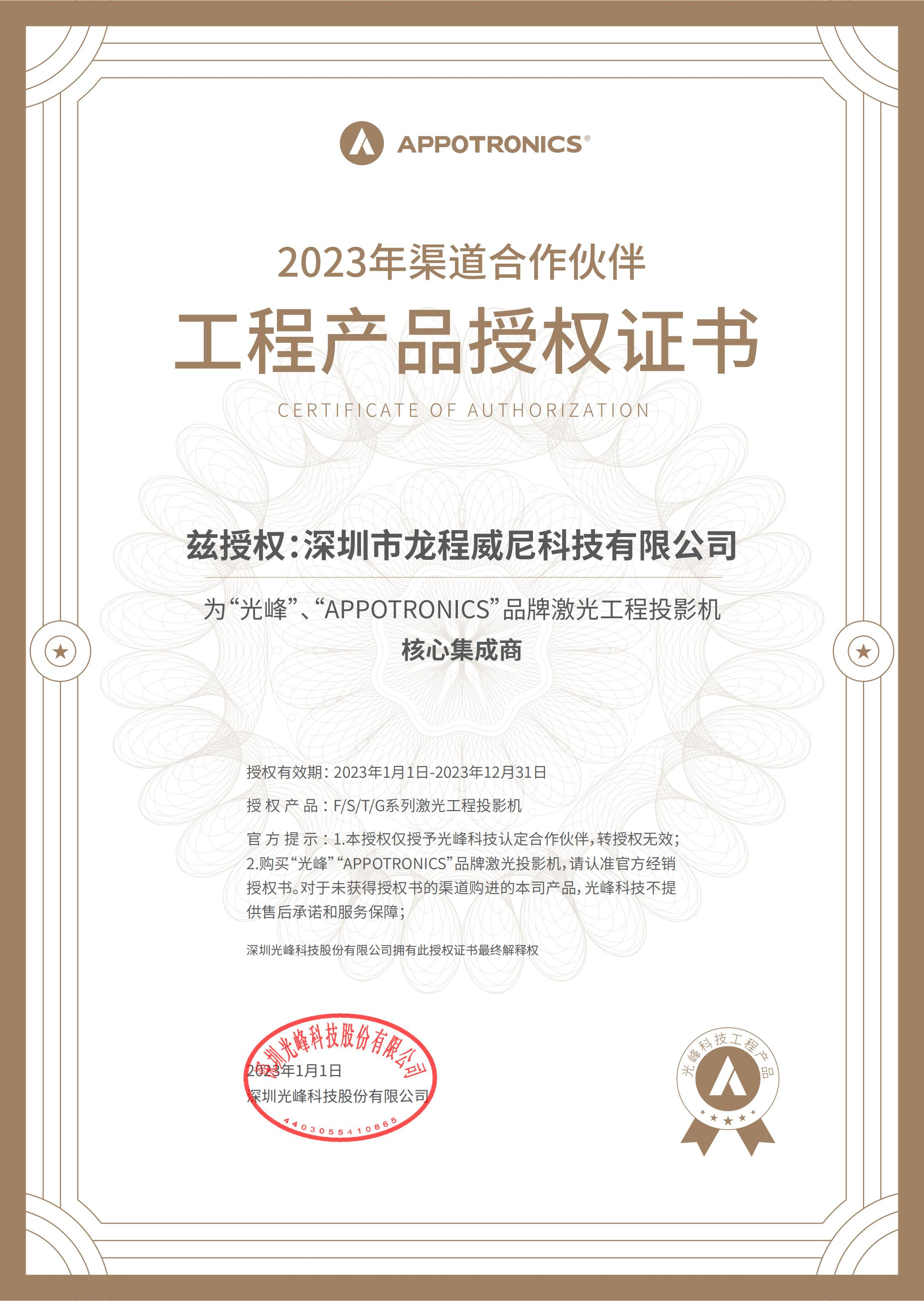 公司被授權(quán)為“光峰”投影機(jī)經(jīng)銷商