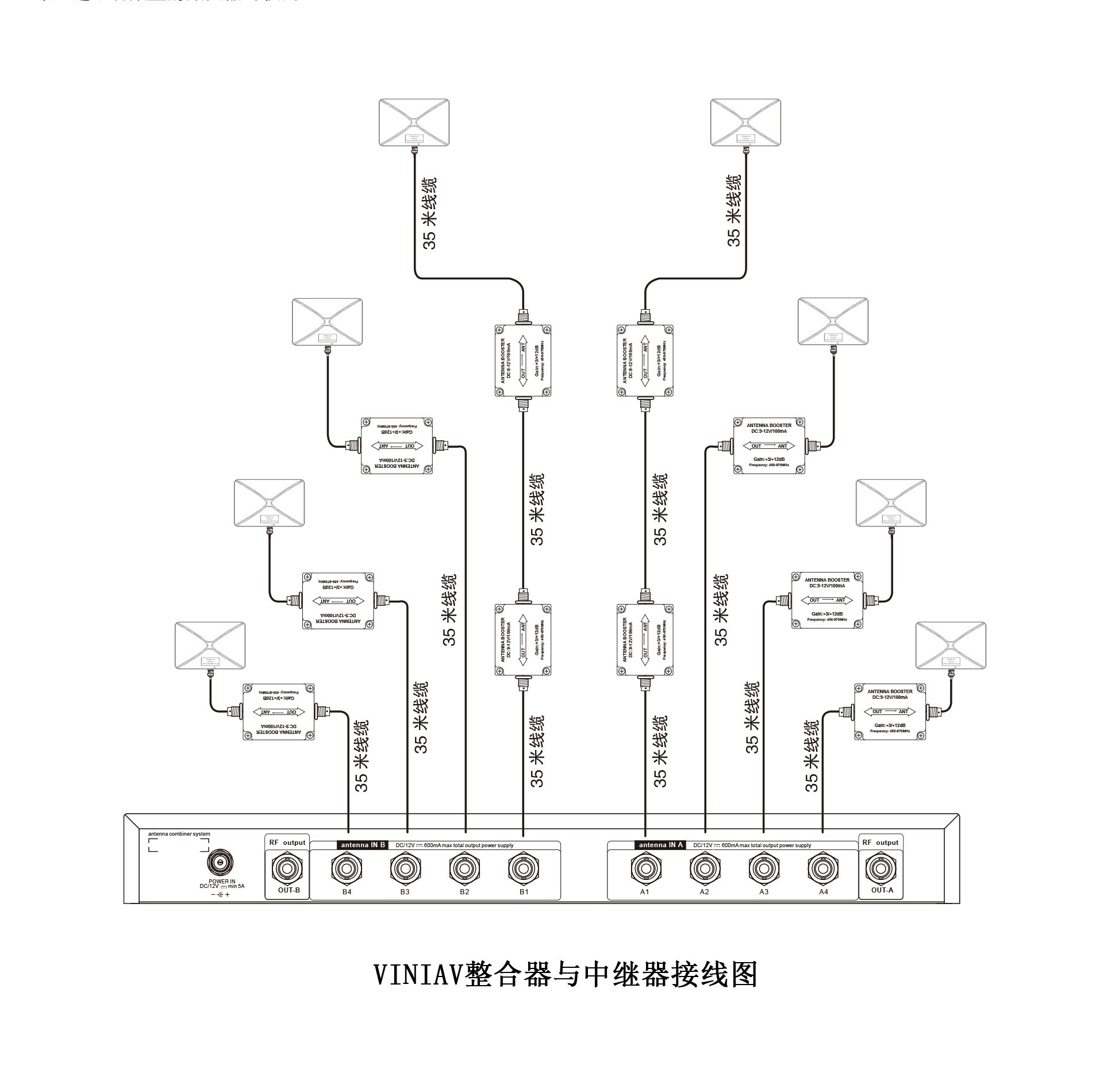 這是一個具有放大功能的UHF天線整合系統(tǒng),它能夠通過將8只天線信號整合成2路給無線接收機來組建無線系統(tǒng)的功能。 同時還能夠獨立放大8只天線射頻信號以補償天線線纜的線損。 8個天線輸入接頭都具備提供12V150mA的增幅電壓。