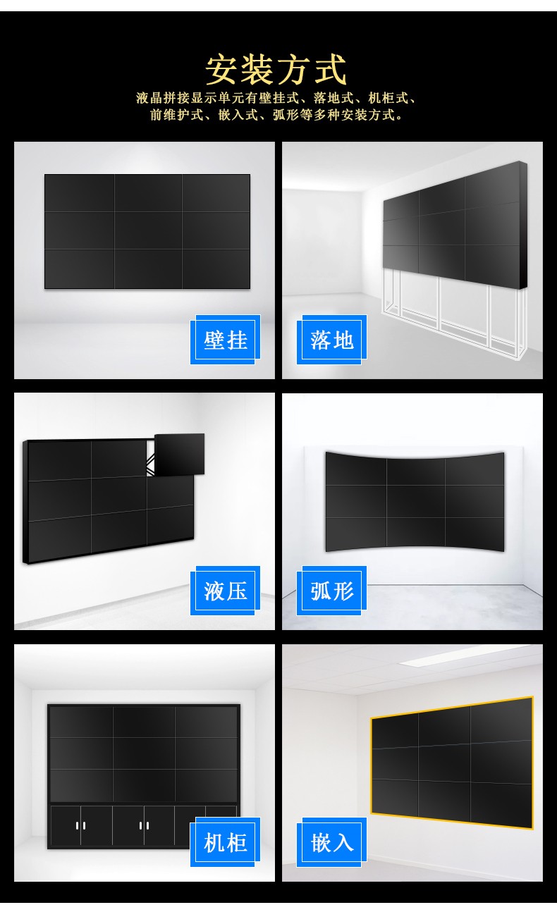 安裝方式:壁掛、嵌入式、落地機(jī)柜、吊裝、電視柜等;